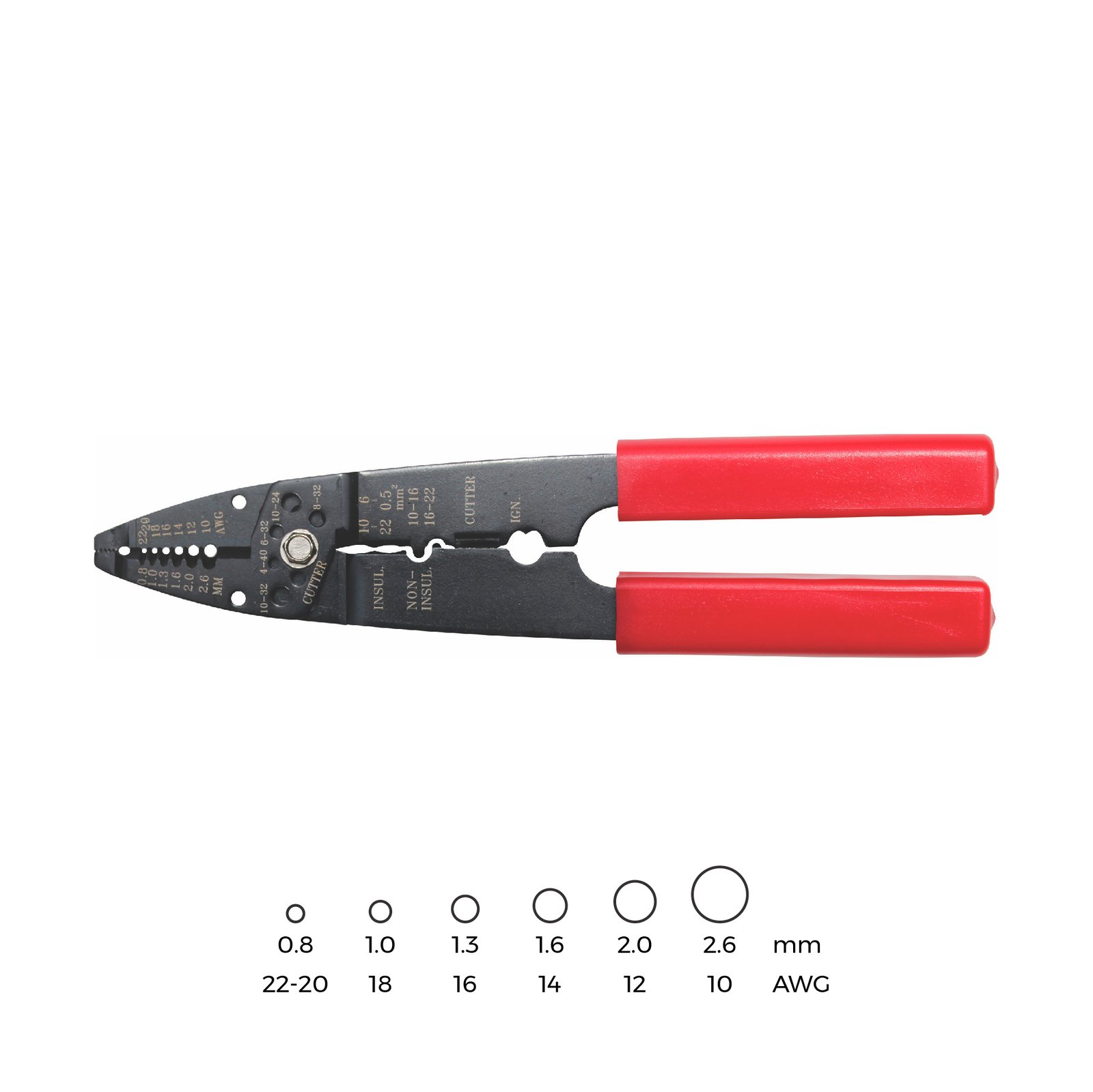 Para desforre, despunte, ponchado y corte de cables multifilares y sólidos de varias medidas. AWG 22-10 con cerrojo de corte y ponchado de terminales aisladas y desnudas.